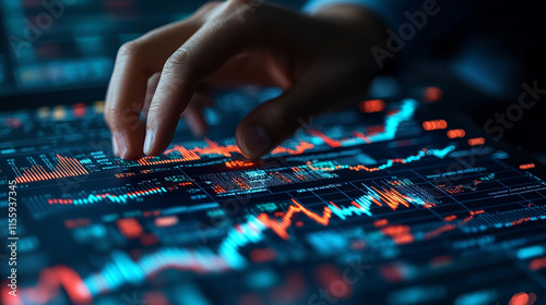 businessman’s hand analyzes a stock market graph on a digital interface, highlighting financial trends. Represents strategy, investment opportunities, and data-driven decision-making in finance