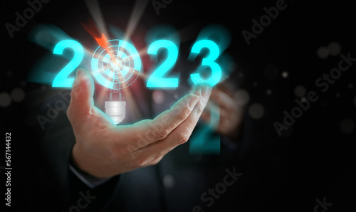 Businessman's hand holding the year 2023 with light blub, dart, and target. Starting new year, business, project, path, goal, or life. Control, manage, choose, and decide by and for yourself.