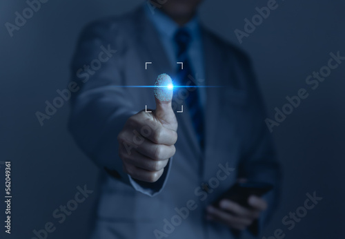 businessman's hand scans fingerprints through a virtual screen. Cybersecurity code concept for biometric authentication.