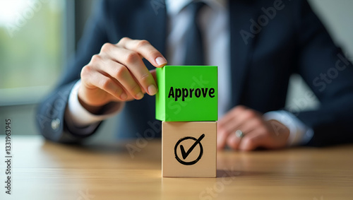 Businessman�s Hand Selecting Green Wooden Cube Block: Approving or Rejecting Business Proposals - A Moral Choice Concept with Empty Space for Customization in Stock Photo