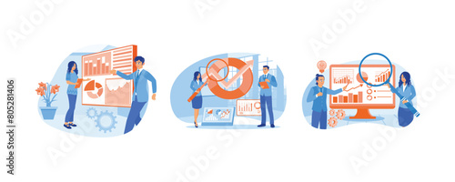 Businessmen and colleagues analyzing graphs. Planning a marketing strategy. Increase business target. Marketing research concept. Set flat vector illustration.
