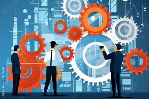 Businessmen in suits discussing large interlocking gears in modern office setting. Focus on collaboration, strategy, innovation, lat design with blue orange color scheme, industrial management.