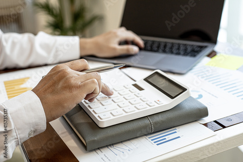 Businessmen press the white calculator to calculate the numbers in the company financial documents, the finance department prepares the document and forwards it to be checked before the meeting.