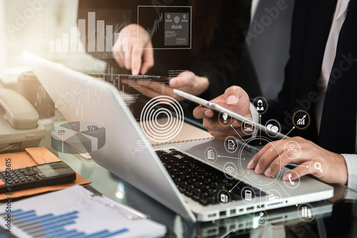 Businessmen team or financial data analysts working with tablets and laptop computers and data graphs together. Plan to analyzing projects in the office.