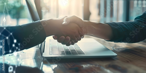 Businessmen use a laptop with virtual handshake icons for business joint venture concepts, data exchange customer connection, teamwork, and successful business design