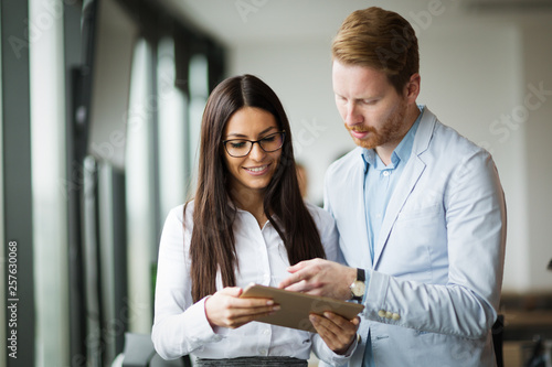 Businesspeople discussing while using digital tablet in office