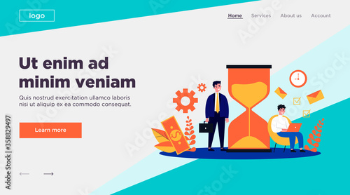 Businesspeople following time table near hour glass. Freelancer working in morning, using laptop under clock. Vector illustration can be used for time management, chronometer, planning day concept
