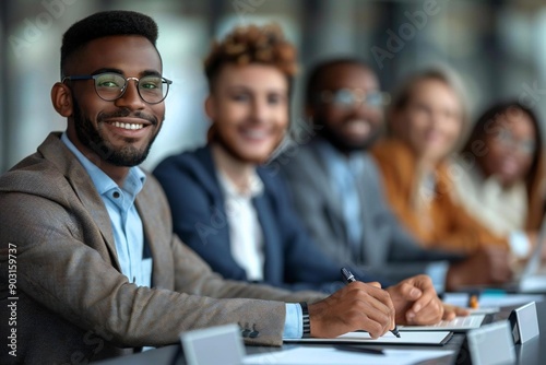 Businesspeople smiling and wearing eyeglasses, looking attentively at beautiful African American businessman explaining in a corporate office presentation.