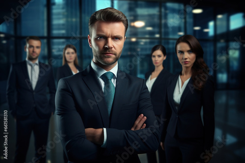 Businesspeople standing while looking at camera with the team in an office