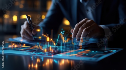 Businessperson analyzing financial data on digital tablet with glowing charts and graphs at night