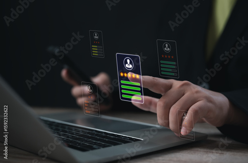 Businessperson evaluating digital star rating profiles on virtual interface, highlighting user feedback, performance scores, the impact of online ratings on professional credibility and reputation.
