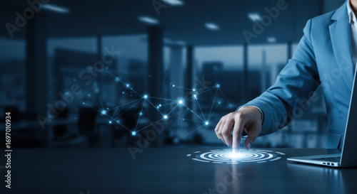 Businessperson in blue suit using futuristic digital interface with holographic network connections and circular touchpad. Concept of technology, innovation, data connectivity, business solutions and