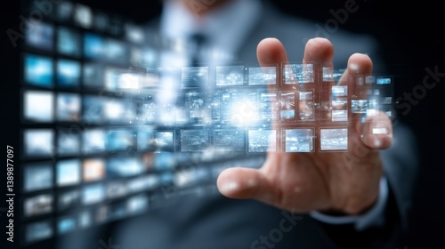 Businessperson interacts with a futuristic digital interface displaying numerous image tiles. Dark background, close up.