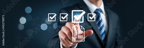 Businessperson selecting options on a digital interface.