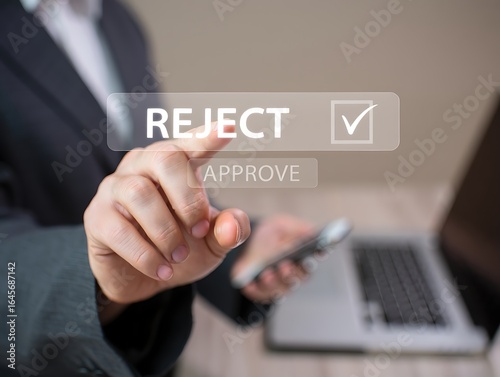 Businessperson Selecting "Reject" Option on a Touchscreen