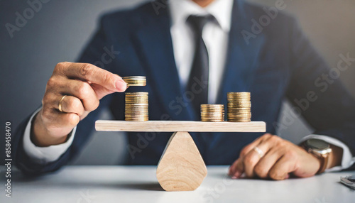 businessperson stands blurred in the background while focusing on balancing stacked coins on a seesaw, symbolizing financial stability, balance, and economic decision-making in business