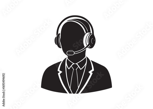 Businessperson wearing headphones, monochrome silhouette, professional communication icon.