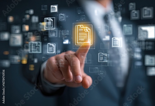 Businessperson's finger touches a glowing document icon over a network of document symbols