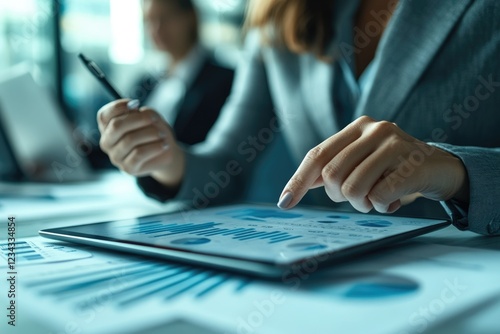 Businesswoman analyzing financial data on a tablet, reviewing charts and graphs for strategic decision-making.
