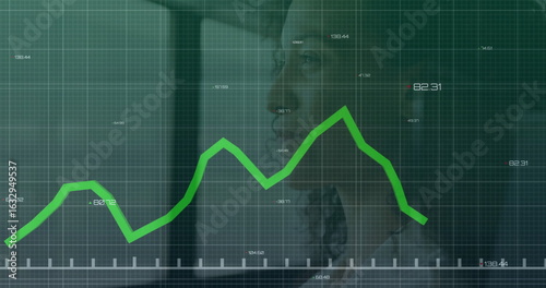 Businesswoman analyzing green line graph on digital screen in modern office, copy space