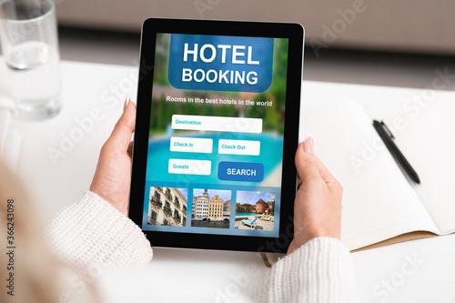 Businesswoman Booking Hotel Accommodation Online Using Tablet Sitting Indoor, Cropped