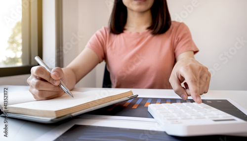 Businesswoman bookkeeper hand use calculator and analysis the graph with laptop at the home office for setting challenging business goals And planning to achieve the new target