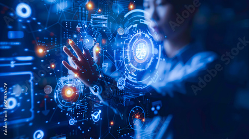 Businesswoman clicking hologram on display. Business center and business office. database, big data. information technology.