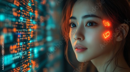 Businesswoman Cybersecurity Interactive Interfaces Featuring Glowing Locks and Encrypted Pathways for Online Safety