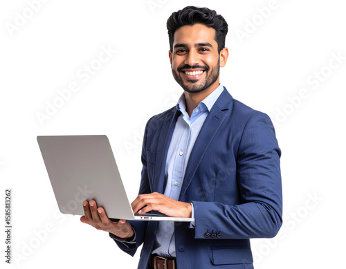 Businesswoman Holding Laptop, Smiling While Engaging with Media and Sharing Content transparent background.