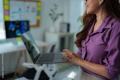 Businesswoman in a purple shirt and beige pants holding a laptop while standing in a modern office, working with technology and analyzing data alongside a desktop computer displaying graphs
