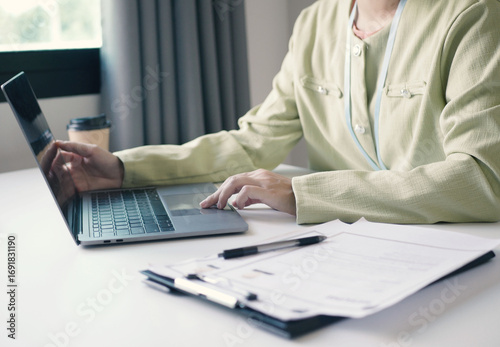 Businesswoman is reading a resume to evaluate a job applicant. Sitting reading a resume to hire candidates, analyzing information before an interview. Recruitment concept