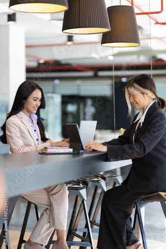 Businesswoman secretary colleague working with laptop in office. Two receptionists work at the counter.