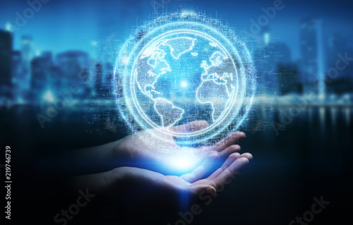 Businesswoman using globe network hologram with America Usa map 3D rendering