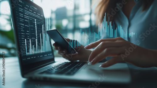 Businesswoman using smartphone and laptop to view innovation reports, digital graphs, analyze market changes and investments during holidays.