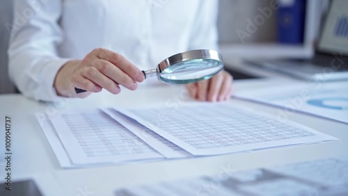 Businesswoman with white blues is analyzing financial data on a spreadsheet using a magnifying glass. Audit and taxes