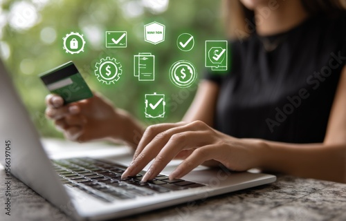 Businesswoman working on laptop with financial and success icons floating above in modern office environment
