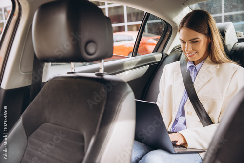 Businesswoman Working Remotely in Car with Laptop on the Go