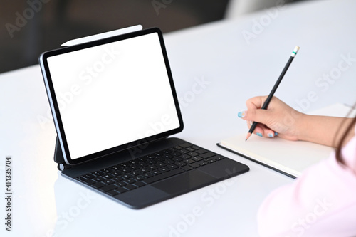 Businesswoman working with tablet computer and writing something in her schedule book at office workplace.