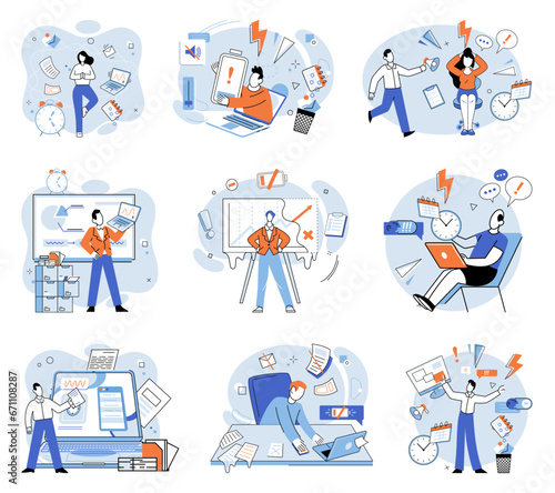 Busy employee vector illustration. The overload responsibilities caused panic among busy employees Multitasking without proper focus can result in failure to complete tasks The busy employee