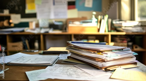 Busy Office Desk with Stacked Documents and Papers in Sunlight