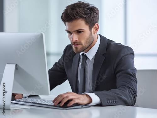 Busy office worker typing at a computer, focused expression.A man wearing a suit and tie is seated at a desk, using a computer