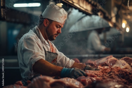 butcher in a slaughterhouse between pieces of meat. generative ai