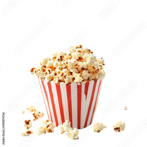Buttery popcorn in a red and white striped bucket spilling onto a white background