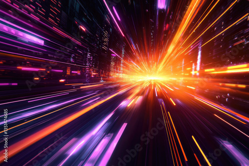 c. A high-tech cyber racing theme with streaks of orange and violet light cutting through a darkened digital landscape, symbolizing speed and futuristic energy.