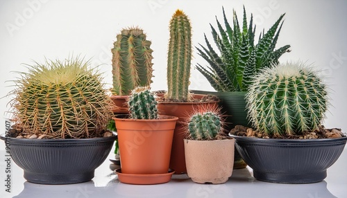 cactus and succulent plants beautifully arranged in eco-friendly pots, isolated on white background. Showcasing their unique forms and natural elegance, perfect for nature lovers and indoor gardening