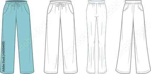 CAD drawing flat vector illustration of women's wide leg lounge pants, front and back views, with drawstring waistband, fashion design template, casual comfortwear