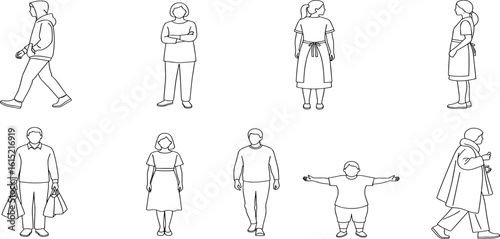 CAD Drawing. Vector illustration of men, women, standing, walking in front back and side view. Symbol for architecture and landscape design drawing.