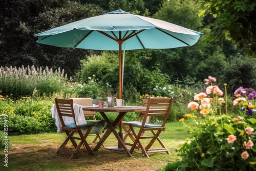 Cafe table with chair and parasol umbrella in the garden. Generative AI