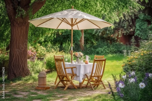 Cafe table with chair and parasol umbrella in the garden. Generative AI