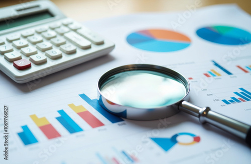 calculator, magnifying glass, pen, color graphs lie on a wooden table